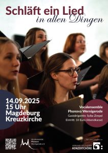 Nach unserer Wettbewerbsteilnahme an den European Choir Games im Juli 2025 in Dänemark kommen wir mit neuen musikalischen Eindrücken und einem bunt gemischten Programm nach Magdeburg. Am Sonntag, 14. September, gastieren wir ab 15 Uhr in der Kreuzkirche im Stadtteil Nordwest. Unter dem Titel „Schläft ein Lied in allen Dingen“ präsentieren unsere Sängerinnen Auszüge aus zwei Wettbewerbsprogrammen sowie einige neu einstudierte Titel. Neben verträumten Romanzen von Johannes Brahms und geistlichen Titeln von Nancy Telfer erklingen vorwiegend deutsche sowie internationale Volksweisen aus Frankreich, Belarus, Slowenien, Schweden und Dänemark. Die künstlerische Leitung übernimmt Gastdirigentin Sylke Zimpel.